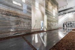 Grey onyx, which is preferred in serious and respectable environments, has the main colors black and white under the grey intermediate color. It is a rare stone with a certain weight in the class of semi-precious stones. Among the onyx varieties, it is a light transmittance raw material that stands out by itself. It is also known as Afyon Smoke in Afyon province. Grey onyx is often used in interiors.