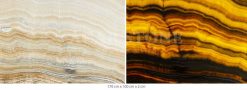 Comme son nom l’indique, il porte le nom de miel car sa couleur ressemble à celle du miel. Il est également connu sous le nom de Wheat spike en Turquie ou Light onyx et Honey onyx dans les pays étrangers. Il est principalement utilisé dans les projets de grande envergure. Il est utilisé dans les halls d’hôtels, les cuisines de villas de luxe, les escaliers et autres endroits similaires. Ou encore, il est utilisé dans des œuvres artistiques avec des ornements décoratifs. En raison de sa structure dure, étant donné qu’il est utilisé dans des endroits de grande taille, il risque de se briser pendant le transport, il est donc fourni par l’usine en époxy et en filet. En raison de sa précieuse structure translucide et dure, il est préféré en 2 cm d’épaisseur afin de refléter la lumière de façon plus spectaculaire. Comme avantage supplémentaire de sa dureté, il est à un niveau très bas qu’il n’y a pas de cassure ou de rugosité sur la surface après l’application. Comme inconvénient, puisqu’il laisse passer 75 % de la lumière, s’il est trop exposé au soleil, sa couleur se décolore, il n’est donc pas recommandé pour une utilisation en extérieur.